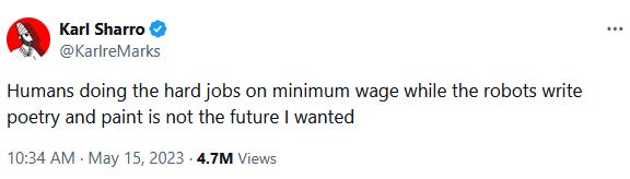 Personally, I would rather look at a painting by someone with mediocre technical skill, but a someone with wishes, desires, intentions that they poured into their art. Likewise I would rather read a poem with some clunky passages that was written by a young adult, expressing their experience in the world, than the most polished artworks chiselled out of billions of unwitting source materials, simply made to appeal to me for 5 seconds, not to express something otherwise inexpressible, before I move onto the next prompt.